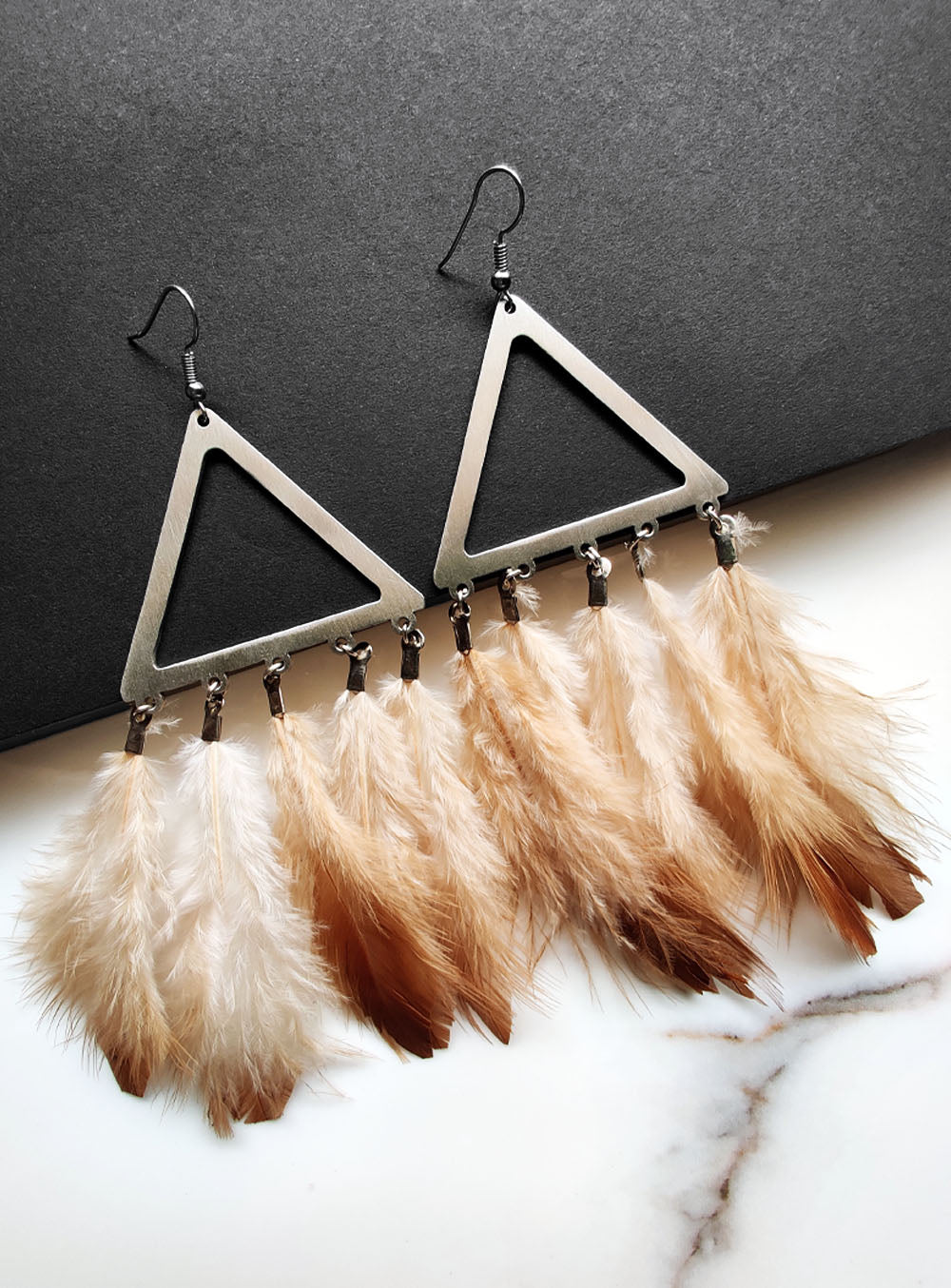 Beautiful statement earrings made with Stainless steel triangle and earthy Beige feathers.