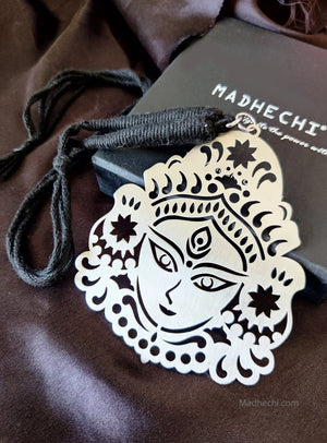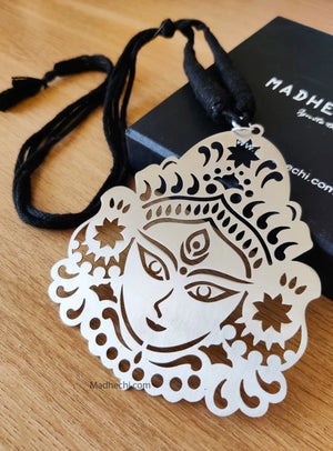 Durga Maa necklace. To make a powerful yet elegant impression, this Durga Maa necklace is perfect for any festive occasion. Wear this necklace with traditional Saree. Durga Maa necklace is made of Stainless steel metal with a luxurious matte finish and is attached with a Black adjustable dori.