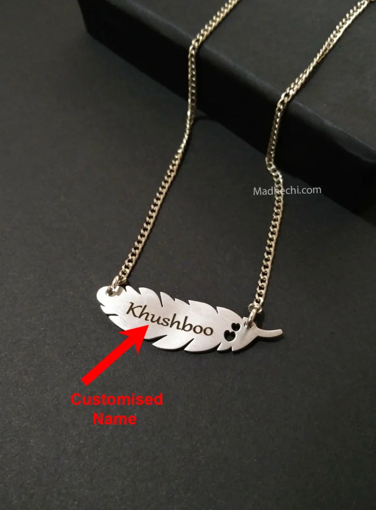 Customized Feather name necklace is the perfect necklace to wear everyday to add a delicate but special charm to your look. The NAME is permanently engraved on the stainless steel metal feather shape. Best delicate name necklace to gift your friend with permanent customized name engraving