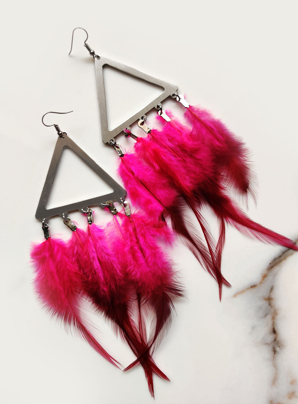 Beautiful statement earrings made with Stainless steel triangle and Hot pink feathers. Hot pink is a vibrant color depicting fun and playfulness .