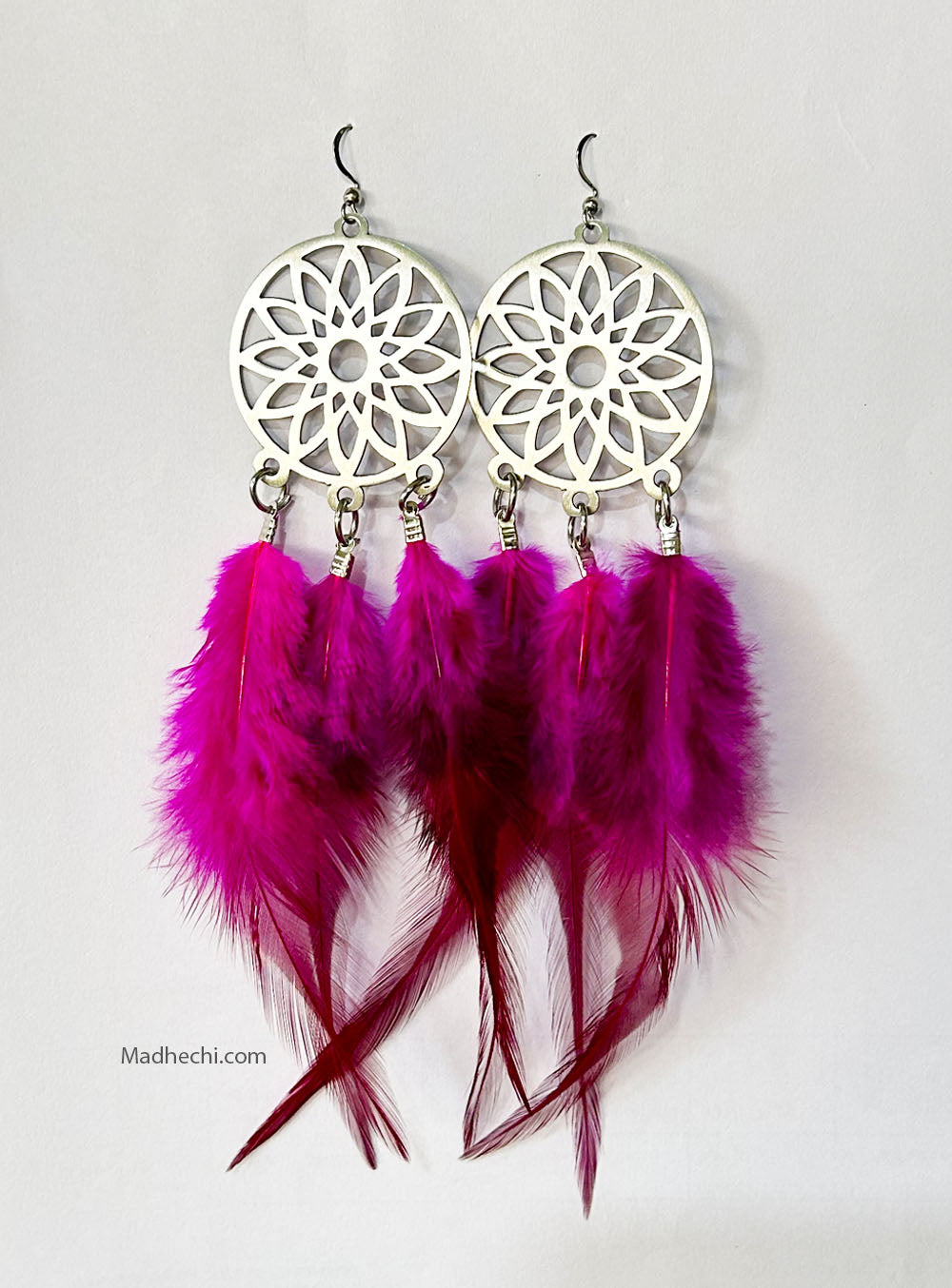 Introducing the Mandala Dream catcher earrings Pink, the perfect accessory to add a touch of bohemian style to any outfit. These earrings are intricately designed with a beautiful mandala pattern and feature a delicate feather hanging from the bottom.