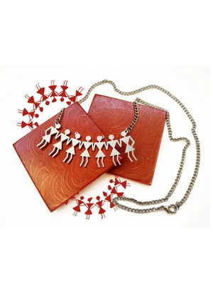 Embracing the beautiful tribal art of India. Mini Warli statement neckpiece is made for those who wish to be in touch with their roots. The pendant is made of stainless steel which is rustfree, non corrosive and highly durable.