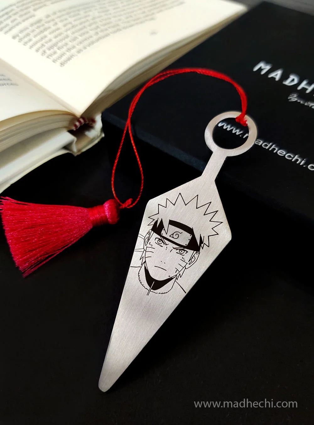 Perfect bookmark for the anime comic lovers. Naruto outline engraved on Kunai is a work of art, made skillfully with intricate engraving on stainless steel metal. surface. The kunai shaped bookmark is attached with a red silk tassel