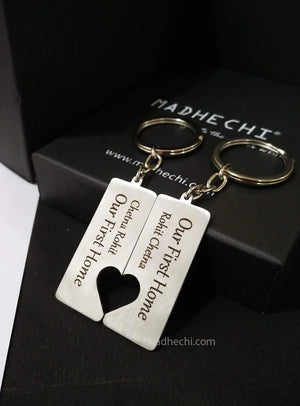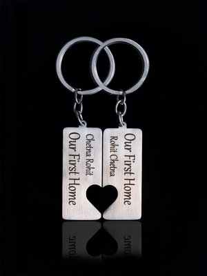 The letters are permanently engraved on the stainless steel metal with laser engraving technology. The words engraved may have slight tinge of dark brown color. To make it pitch black, wipe the words gentle with cloth and 1-2 drops of regular oil. Buy Couples New Home Keyrings online on Madhechi.