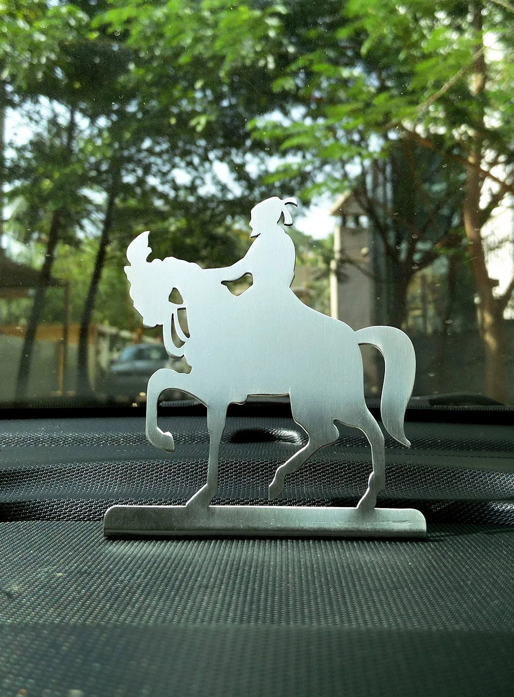 Shivaji Maharaj car dashboard stand fully made in Stainless steel metal, silverish grey color, with a luxurious matte finish.